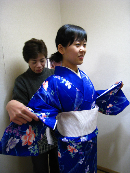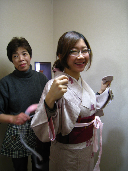 珊小湖要被五花大綁啦!!和服一層層疊裹得緊緊,感覺好像被包粽子一樣喔!!肚子感覺上了很多條繩子,雖然不至於呼吸困難,但是很緊繃得有點詭異,整個人馬上挺了起來。老闆娘很熟練的咻咻咻,沒一會珊小湖就著裝完畢。