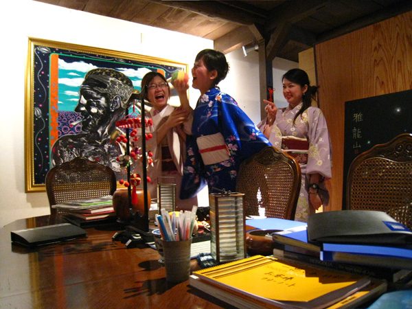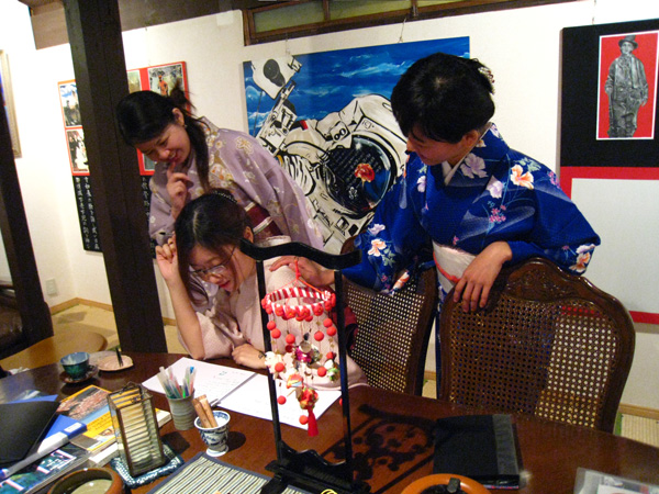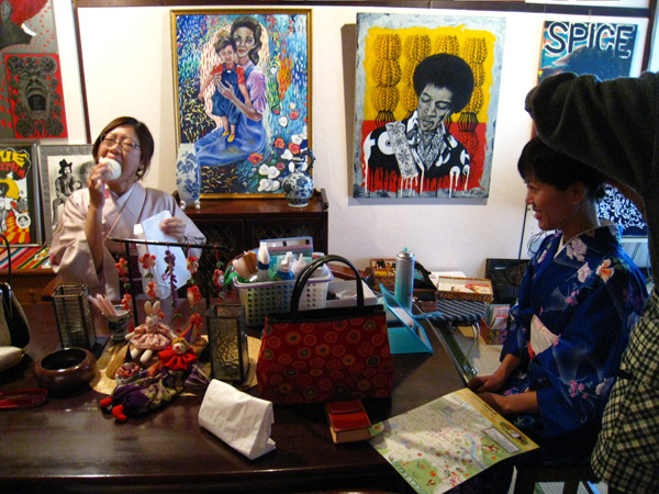 我們預約10點是今天第一組客人,時間比較充裕而且和服的選擇也多。遊月的老闆娘直誇秀雲很厲害,和服穿得很好呢!!秀雲的腰帶鬆了還很熱心幫她調整腰帶,說下次有機會可以帶和服來這邊換也沒關係,霹靂啪啦一直和我們閒聊。感覺她不是以營利為目標,對和服很熱衷用心經營她的窩。老闆娘的先生是畫家,據說ハイブリッド美術館內都是她先生和合夥人的作品,很難想像美術館裡頭有和服變身的服務吼!!