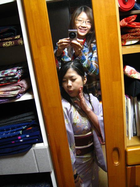 老闆娘再幫秀雲調整腰帶時,我和曉清先在外頭東挑西選。挑和服真是門學問,選了自己喜歡的顏色和花色卻一點都不適合,最後決定的和服款式是一開始完全不會想選的,就是這麼妙